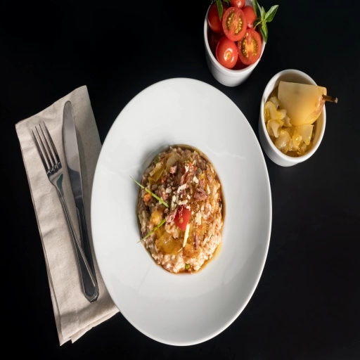 Risoto de Carne Seca e Pêra Caramelizada